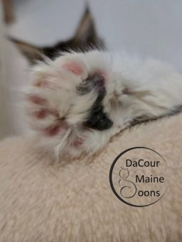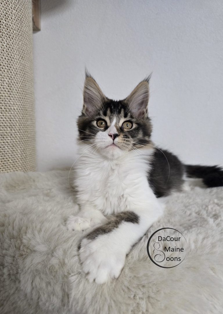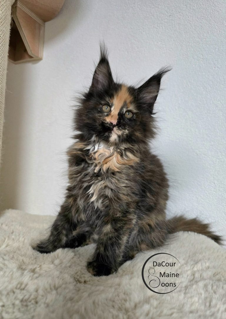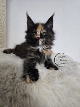 Kaja ist eine 10 Wochen alte Maine-Coon-Kätzin aus unserer eigenen Zucht. Bereits in diesem jungen Alter zeigt sie einen sehr harmonischen Gesamteindruck mit gutem Knochenbau, rassetypisch großen Ohren und einem wachen, aufmerksamen Blick.